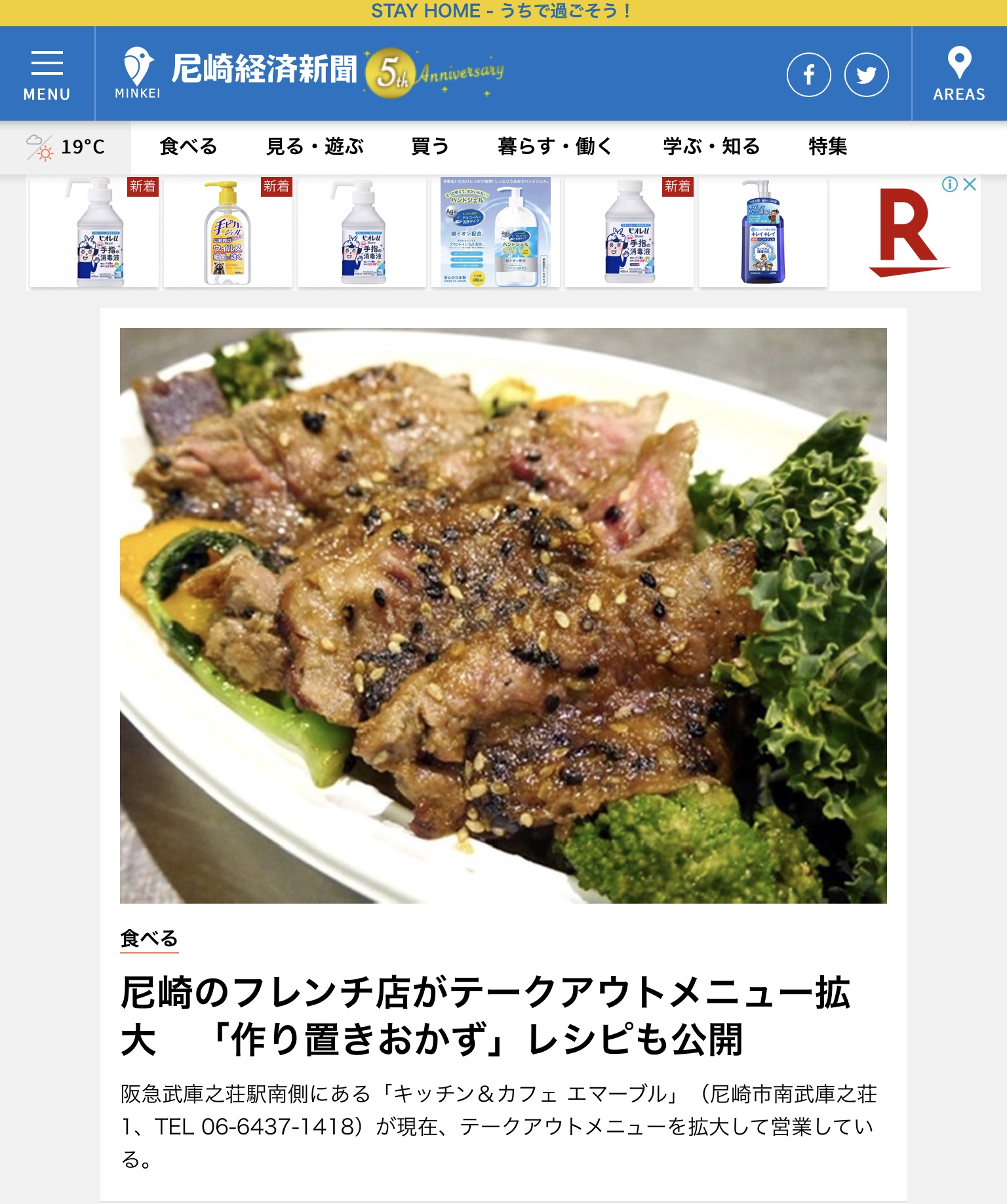 昨日27日(月)、広域尼崎圏のビジネス&カルチャーニュースをお届けするインターネットの情報配信サービス「尼崎経済新聞」でエマーブルのテイクアウトが紹介されました。