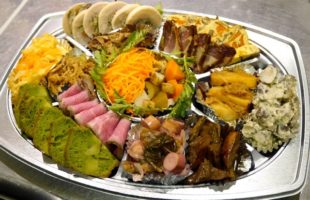 プレーンオムレツ(トマトソース)、フォカッチャ、ミート(今回は茶美豚のロースト)、サラダ、デリ3種、お飲み物