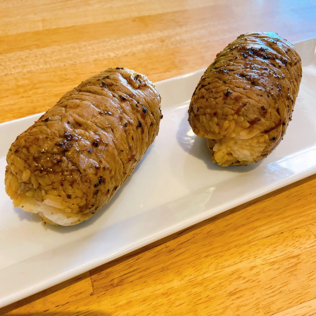 2.暖かいご飯にバーベキューソースをかけまぜる。適当な大きさの俵おにぎりを作る。