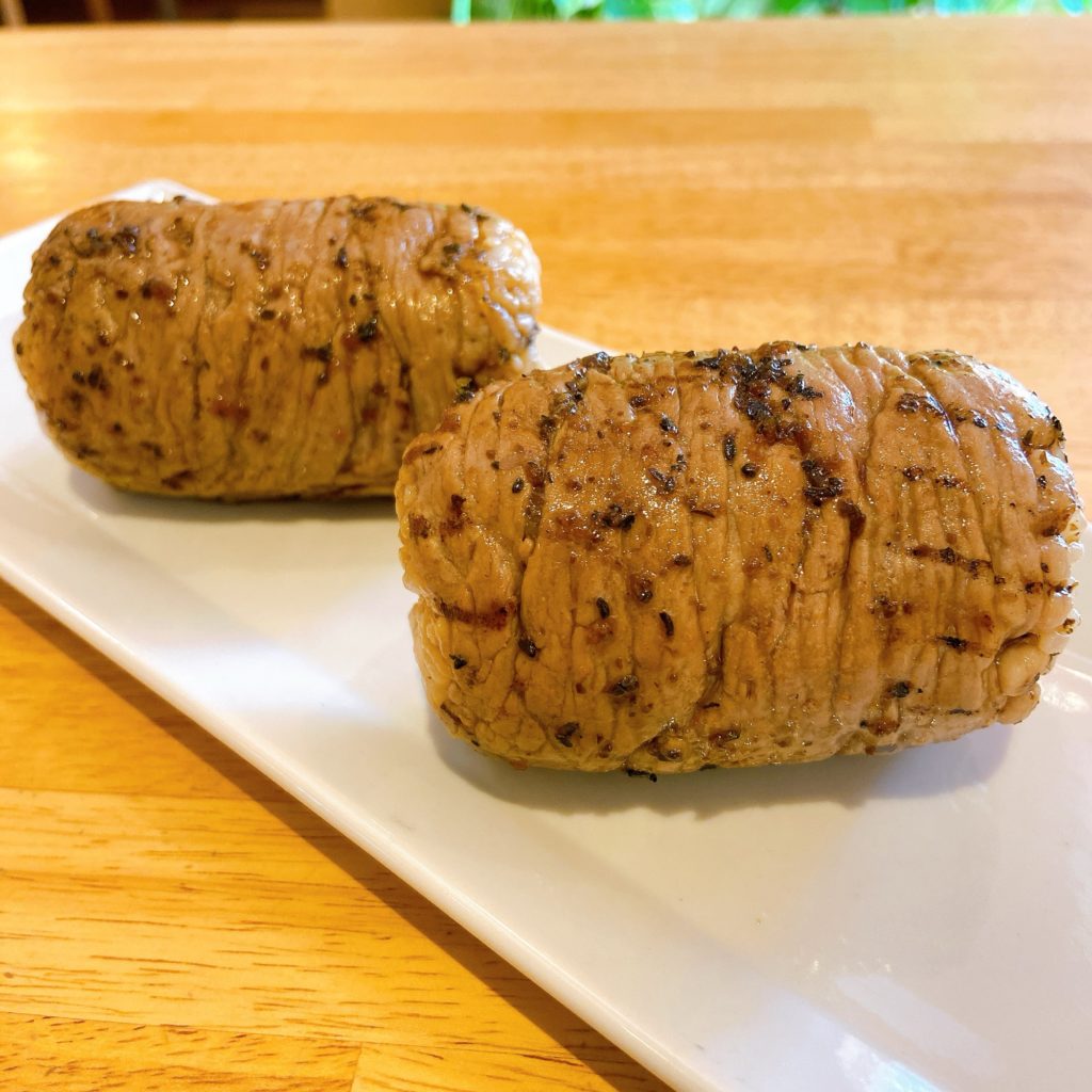 3.ラップを広げて1の肉を広げる。肉の上に2を乗せラップでクルリと巻く。