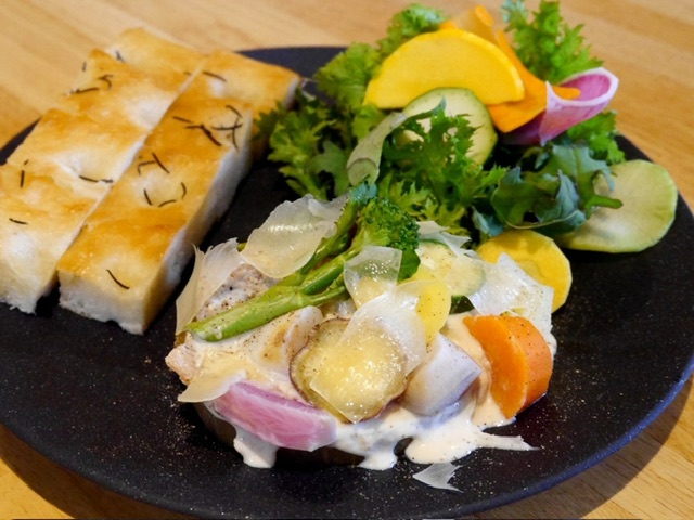 和風出汁で炊いた中野ふぁ〜むの冬瓜の煮込み、肉団子。干し椎茸と無農薬の玉ねぎのクリームソース。季節の温野菜を添えて、上から削ったペコリーノ・ロマーノをトッピング。