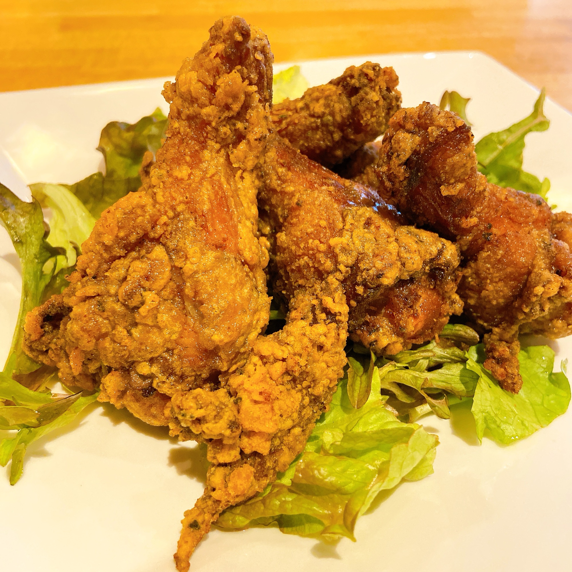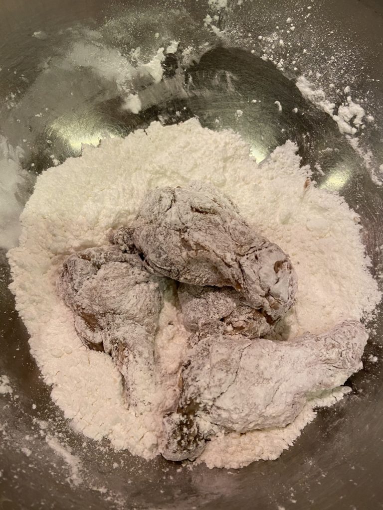 4.薄力粉と片栗粉を1対1で合わせ、鶏肉にらまぶす。油で揚げる。