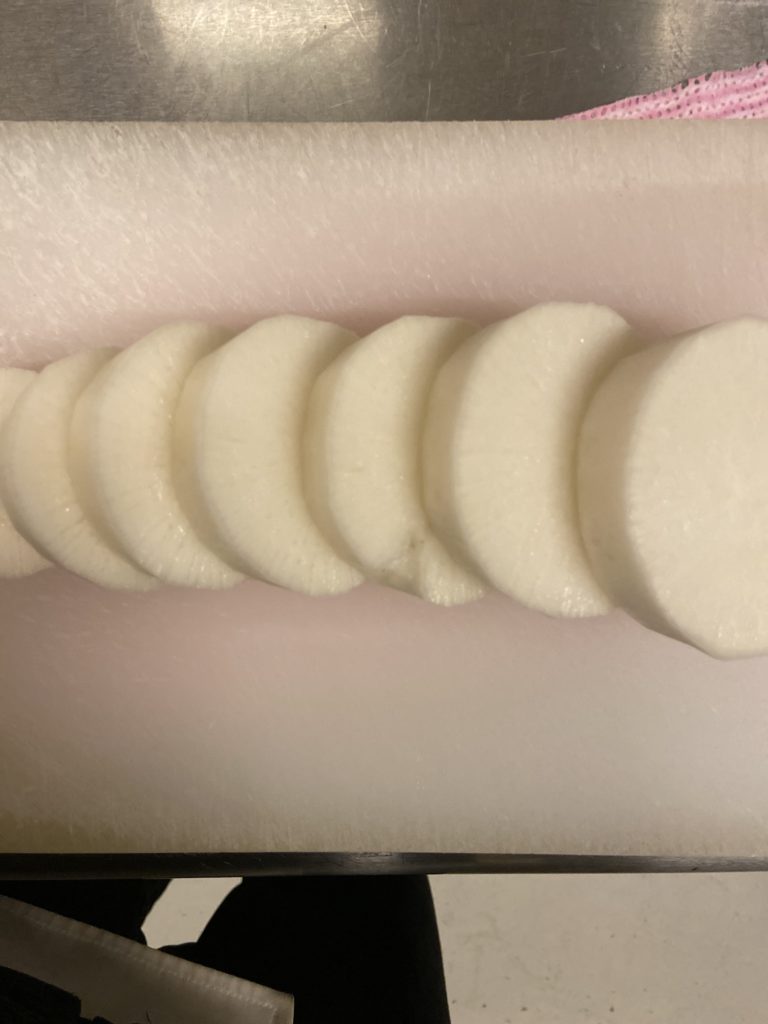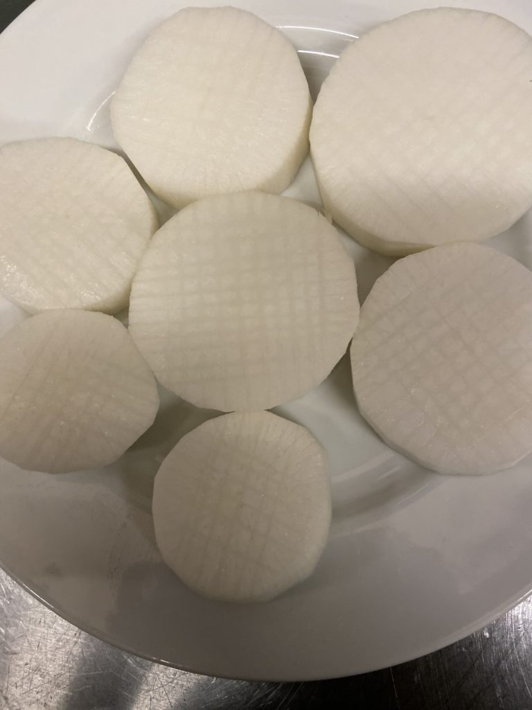2.大根の両面に格子模様に切り込みを入れ、電子レンジ7分ぐらい加熱する。