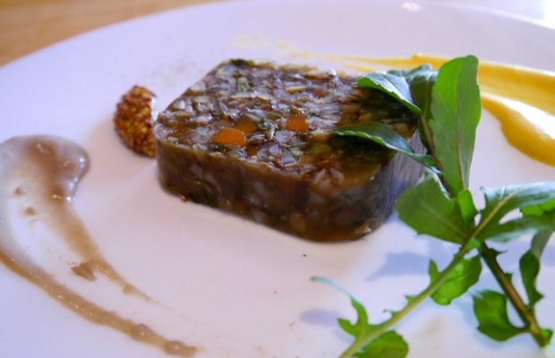 オードブル「レンズ豆とそばの実と無農薬の黒キャベツの煮込みのテリーヌ」